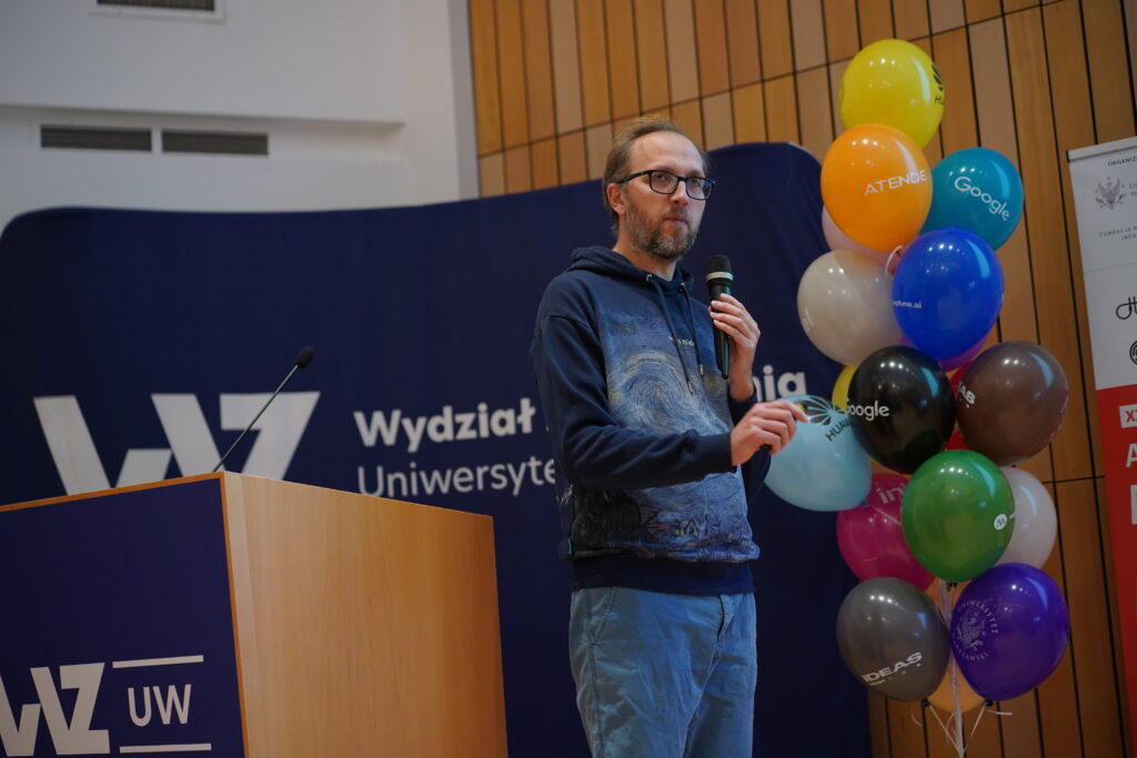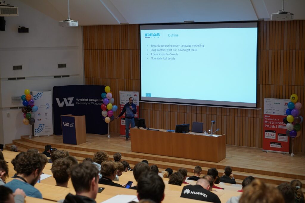 Pierwszego dnia zawodów Piotr Miłoś, lider zespołu badawczego Sekwencyjne podejmowanie decyzji w IDEAS NCBR, wygłosił jeden z wykładów poprzedzających zawody, zatytułowany Long context and code generation.