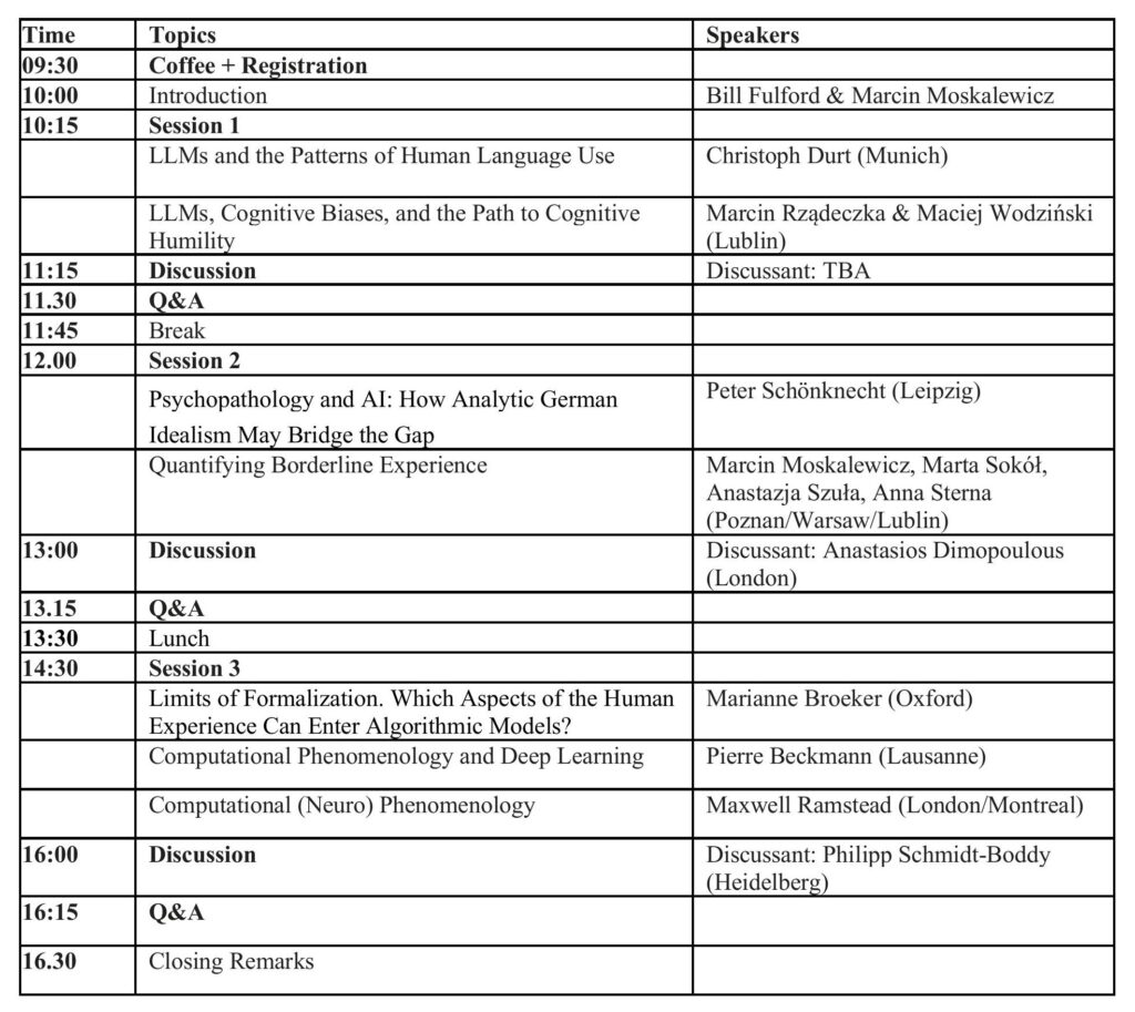 Confirmed speakers: Bill Fulford, Marcin Moskalewicz, Christoph Durt, Marcin Rządeczka, Maciej Wodziński, Peter Schönknecht, Marta Sokół, Anastazja Szuła, Anna Sterna, Anastasios Dimopoulos, Marianne Broeker, Pierre Beckmann, Maxwell Ramstead, Philipp Schmidt